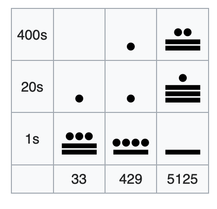 Some cultures did not evolve a decimal system. Some, like the Maya, used the vigesimal system which is base-20. Think of it as using both fingers and toes before having to “carry one” and switch to two digits. A big difference is that instead of “carry the one” to the left as we do in decimal when we go over ten, the Maya built their large numbers vertically. The number four-hundred twenty-nine (429)10 for example would be represented by the Maya as (119)20 (see middle column in image).