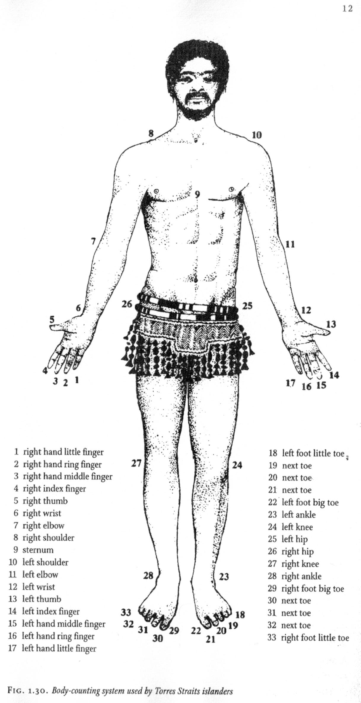 Some cultures even used their whole bodies when counting. According to Ifrah, the Cambridge Anthropological Expedition reported in the late 1800s that the Torres Straits Islanders “counted visually” up to thirty-three (33)10. Note that for a true base-33 system, they would need a symbol, or equivalent as you’ll see, for each number from 1 to 33, without having to resort to two-digit representaiton (as I just had to do for the number “33” because you and I communicate within a decimal system.)